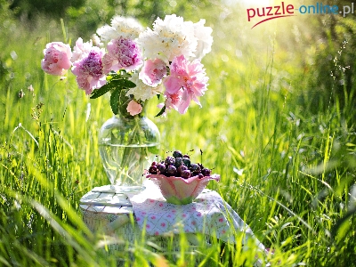 Czereśnie, Poranek, Piwonie, Bukiet, Trawa