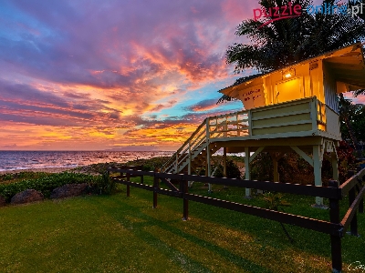 Zachód słońca, Morze, Wieża ratownicza, Hawaje, Palmy, Chmury