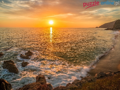 Brzeg, Góry, Chmury, Plaża, Morze, Skały, Wschód słońca