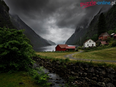 Chmury, Kamienie, Droga, Góry, Domy, Ciemne, Jezioro, Potok