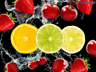 Pomarańcza, Tło czarne, Czereśnie, Cytryna, Truskawki, Owoce, Limonka, Woda