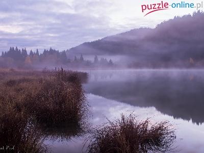 Mgła, Góry Jura, Francja, Jezioro Lac de Lamoura, Trawy, Departament Jura