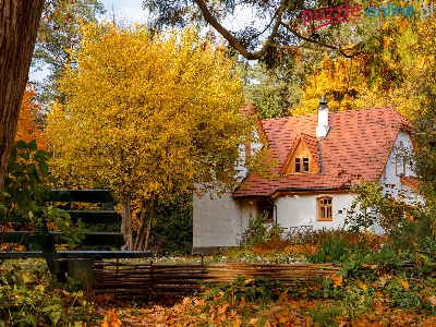 Dom, Drzewa, Jesień, Dachówka, Biały, Czerwona, Ławka