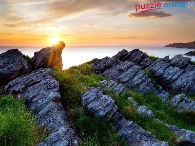 Puzzle Trawa, Morze, Skały, Promienie Słońca