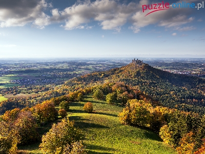 Zamek Hohenzollern, Wzgórza, Jesień, Badenia-Wirtembergia, Las, Góra Hohenzollern, Niemcy, Chmury