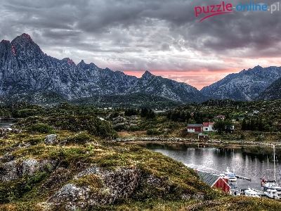 Wyspa Austvagoy, Lofoty, Domy, Zatoka, Żaglówka, Góry, Norwegia, Miejscowość Kabelvag, Motorówki