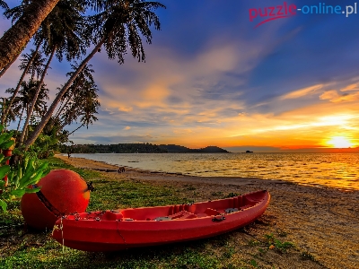 Plaża, Boja, Zachód słońca, Kajak, Palmy, Morze