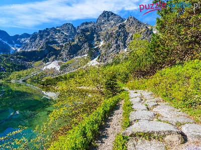 Jezioro Morskie Oko, Góry Tatry, Ścieżka, Polska, Mięguszowickie Szczyty, Drzewa