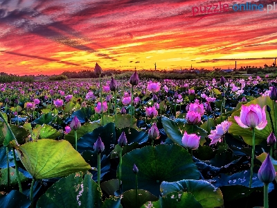 Niebo, Zachód słońca, Kwiaty, Lotosy, Chmury