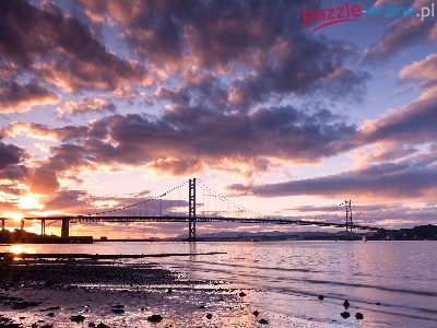 Wschód słońca, Chiny, Rzeka, Most, Chmury