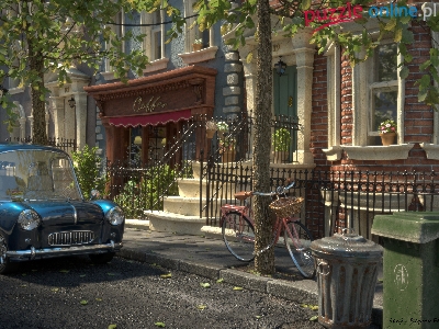Samochód, Dom, Kawiarenka, Digital Art, Uliczka, Rower