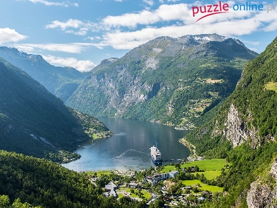 Niebo, Norwegia, Fiord Geirangerfjorden, Chmury, Statek pasażerski, Góry, Lasy, Wieś Geiranger