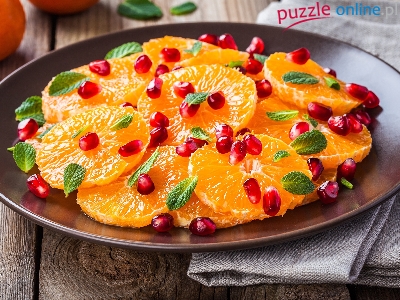 Plasterki, Listki, Talerz, Granatu, Pomarańcze, Pestki, Poczęstunek