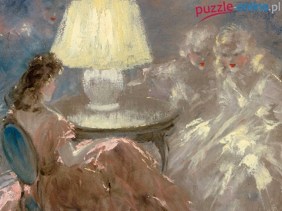 Kobiety, Malarstwo, Lampka, Obraz, Louis Icart, Stół