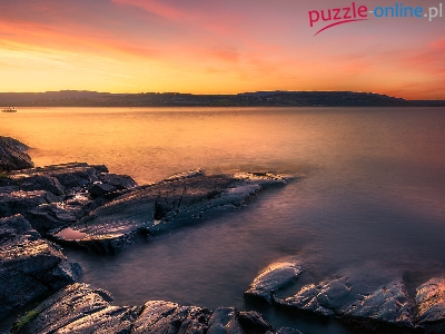 Jezioro Tyrifjorden, Zachód słońca, Norwegia, Okręg Buskerud, Skały