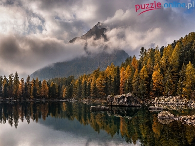 Jezioro Lago di Saoseo, Szwajcaria, Chmury, Dolina Valle di Campo, Skały, Góry, Las, Kanton Ticino