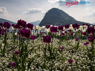 Ocean, Niebo, Tulipany, Kwiaty, Góry