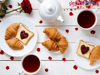 Marmolada, Talerzyki, Róża, Deski, Tosty, Miłosne, Śniadanie, Filiżanki, Dzbanek, Rogale, Herbata, Płatki