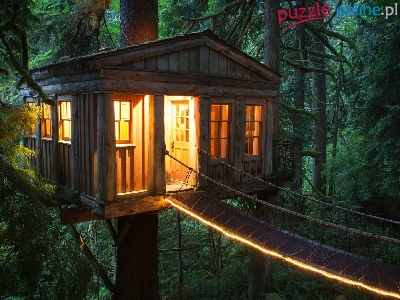 Las, Most wiszący, Domek, Drzewa, Światło