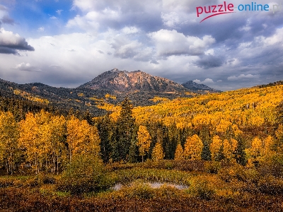 Góry East Beckwith Mountain, Stany Zjednoczone, Hrabstwo Gunnison, Drzewa, Chmury, Jesień, Niebo, Stan Kolorado