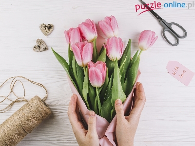 Tulipany, Deski, Dłonie, Różowe, Nici, Kwiaty, Nożyczki, Serduszka