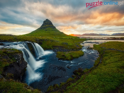 Wodospad Kirkjufellsfoss, Chmury,  Islandia, Półwysep Snaefellsnes, Góra Kirkjufell