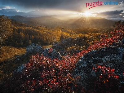 Brzozy, Góry Ałtaj, Roślinność, Drzewa, Rosja, Jesień, Kraj Ałtajski, Skały, Las, Promienie słońca, Biełokuricha