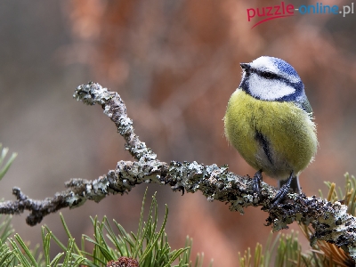 Modraszka zwyczajna, Gałąź, Ptak, Sikorka, Trawa