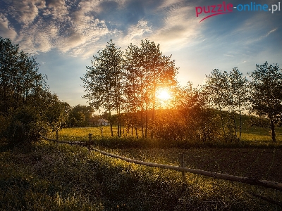 Drzewa, Chmury, Wieś, Wschód słońca, Łąka, Roślinność, Domek