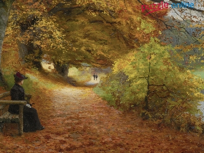 Malarstwo, Kobieta, Droga, A wooded path in autumn, Jesień, Obraz, Hans Andersen Brendekilde, Ławka