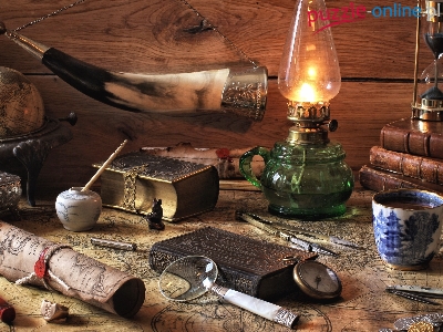 Lampa naftowa, Klepsydra, Globus, Kubek, Książki, Zegarek, Kompozycja, Kompas, Róg, Mapy, Lupa, Szkatułka