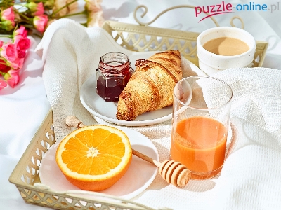 Croissant, Rogalik, Sok, Pomarańcza, Taca, Kawa, Śniadanie, Dżem, Kwiaty