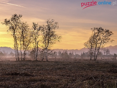 Brzozy, Świt, Wschód słońca, Poranek, Drzewa, Pole, Mgła