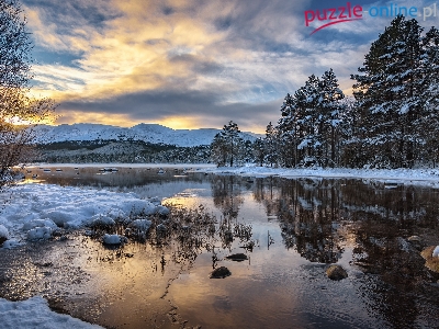 Drzewa, Jezioro, Chmury, Góry, Zima, Wschód słońca