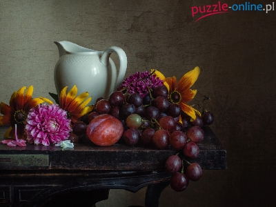 Dzbanek, Åšliwka, Owoce, Kwiaty, Rudbekie, Porcelanowy, Chryzantemy, Winogrona