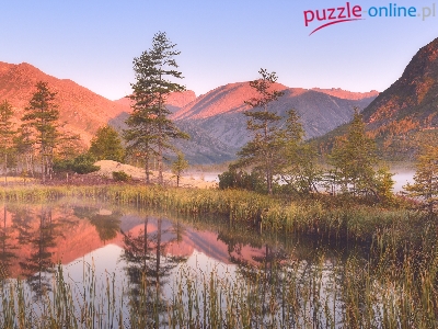 Kołyma, Jezioro Jack London, Mgła, Drzewa, Odbicie, Rosja, Góry Kołymskie, Obwód magadański, Trawy