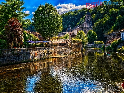 Domy, Francja, Kajak, Miasto Brantome, Rzeka, Roślinność