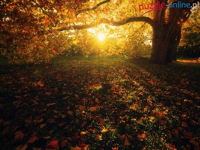 Jesień, Promienie słońca, Park, Drzewa, Liście
