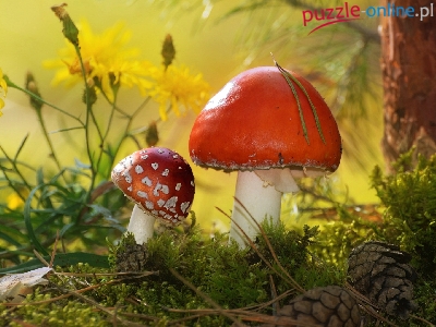 Muchomory, Kwiaty, Dwa, Grzyby, Szyszki