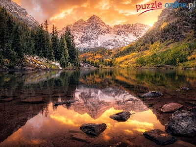 Szczyty Maroon Bells, Odbicie, Drzewa, Jezioro Maroon Lake, Stany Zjednoczone, Góry Skaliste, Stan Kolorado, Kamienie