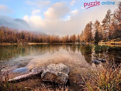 Szuwary, Drzewa, Chmury, Kamienie, Włochy, Jezioro Lago di San Pellegrino, Trydent-Górna Adyga, Las, Dolina Vall di Fassa, Góry Dolomity, Mgła