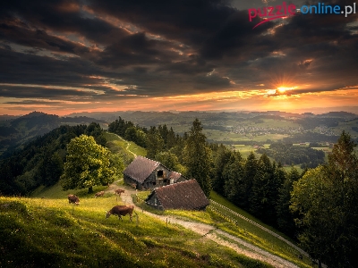 Domy, Krowy, Góry Alpy, Niebo, Szwajcaria, Dolina, Łąka, Stodoły, Zachód słońca