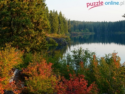 Drzewa, Las, Jesień, Jezioro, Kolorowe, Krzewy
