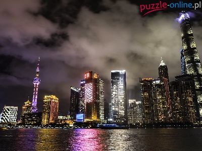 Morze, Chiny, Wieżowce, Szanghaj, Światła, Rzeka Jangcy, Noc, Miasto, Dzielnica Pudong, Budynki