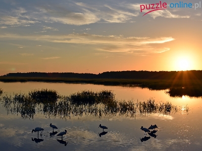 Puzzle Ptaki, Wschód słońca, Jezioro, Trawy