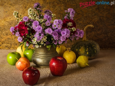 Bukiet, Wazon, Owoce, Jabłka, Dynia, Astry marcinki, Kompozycja, Kwiaty, Gruszki