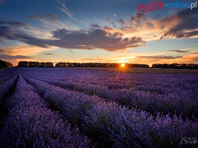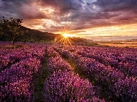 Drzewa, Chmury, Pole, Lawenda, Promienie słońca