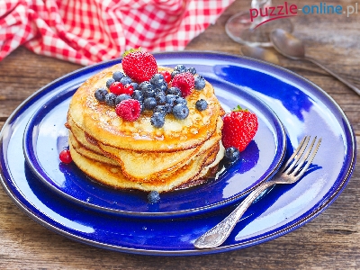 Borówki, Talerzyki, Ściereczka, Niebieskie, Deski, Owoce, Truskawki, Naleśniki, Widelec, Maliny