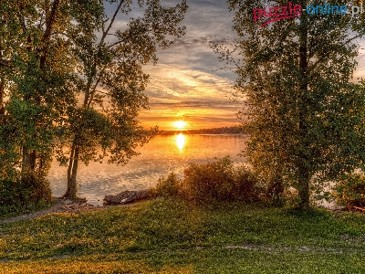 Puzzle Drzewa, Wschód słońca, Jezioro, Chmury