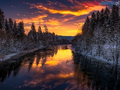 Las, Zima, Rzeka, Drzewa, Zachód słońca